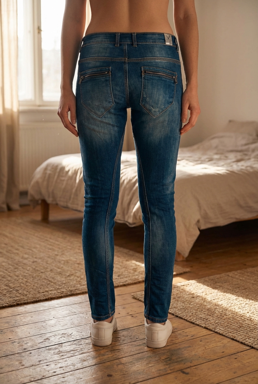 Jeans Skinny Guess T27 debout, face à la caméra, dans une chambre à la lumière douce, avec une lumière naturelle filtrant par la fenêtre.