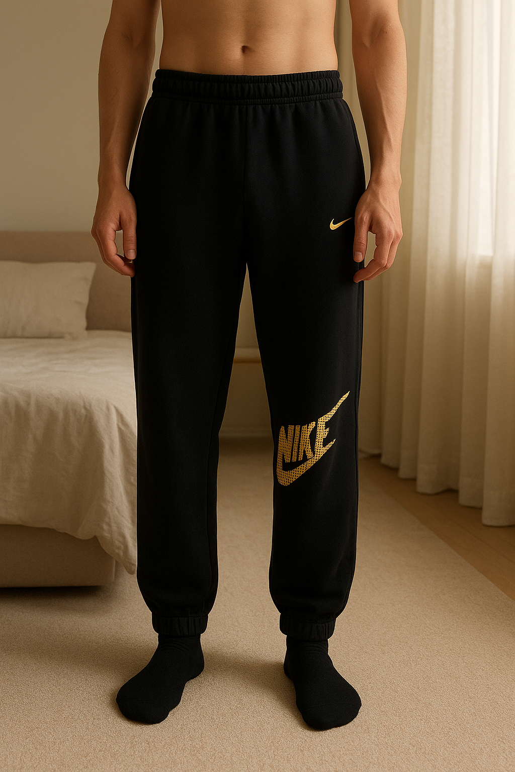 Jogging Nike noir debout, face à la caméra, dans une chambre à la lumière douce, avec une lumière naturelle filtrant par la fenêtre.