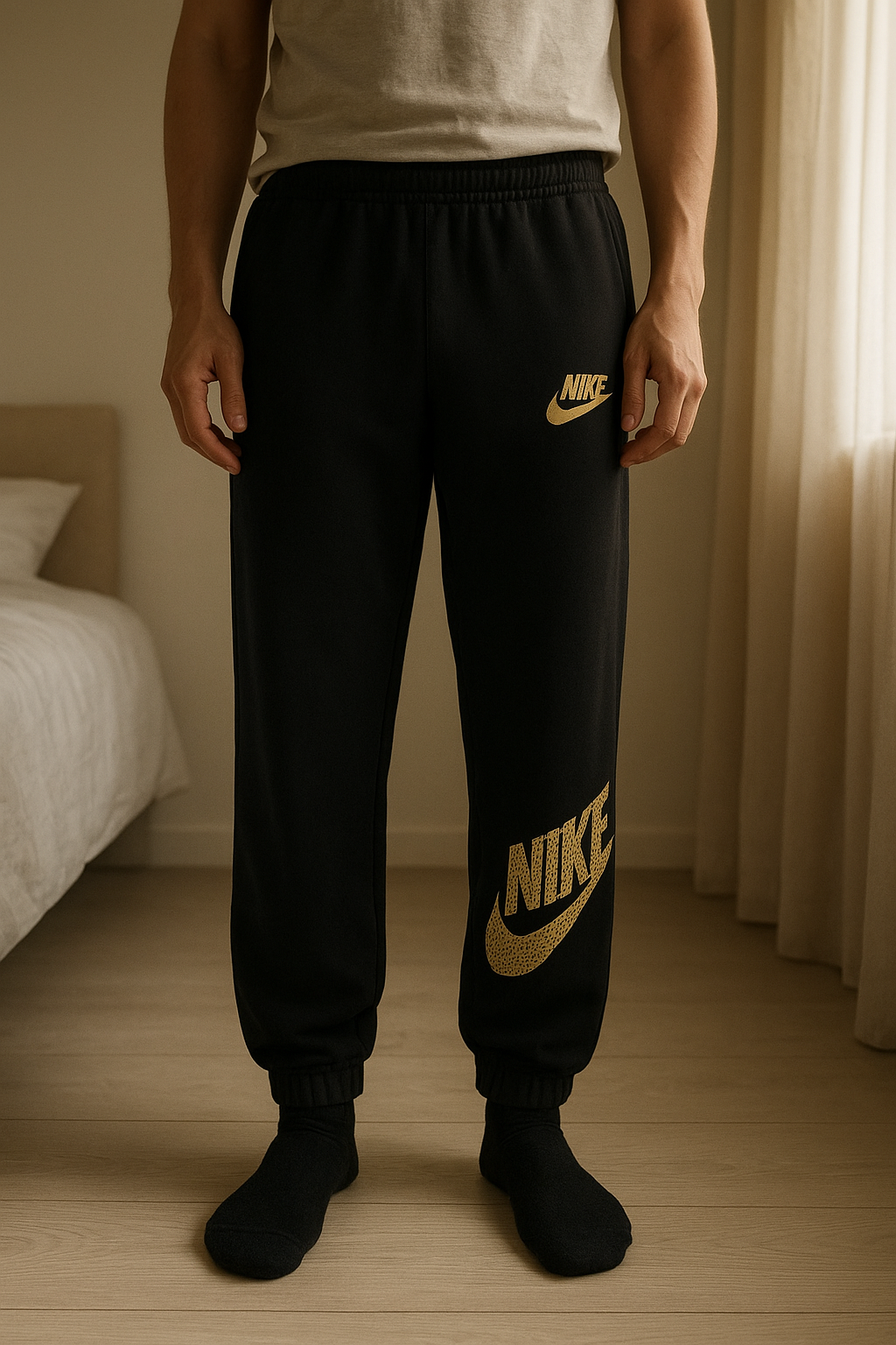 Jogging Nike noir debout, face à la caméra, dans une chambre à la lumière douce, avec une lumière naturelle filtrant par la fenêtre.