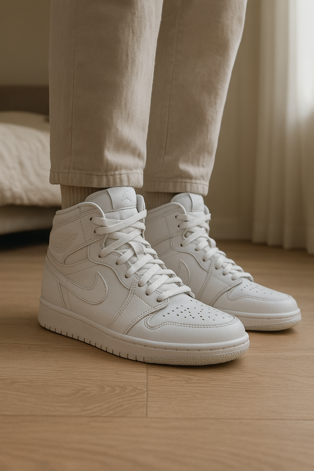 Jordan 1 mid blanche debout, face à la caméra, dans une chambre à la lumière douce, avec une lumière naturelle filtrant par la fenêtre.