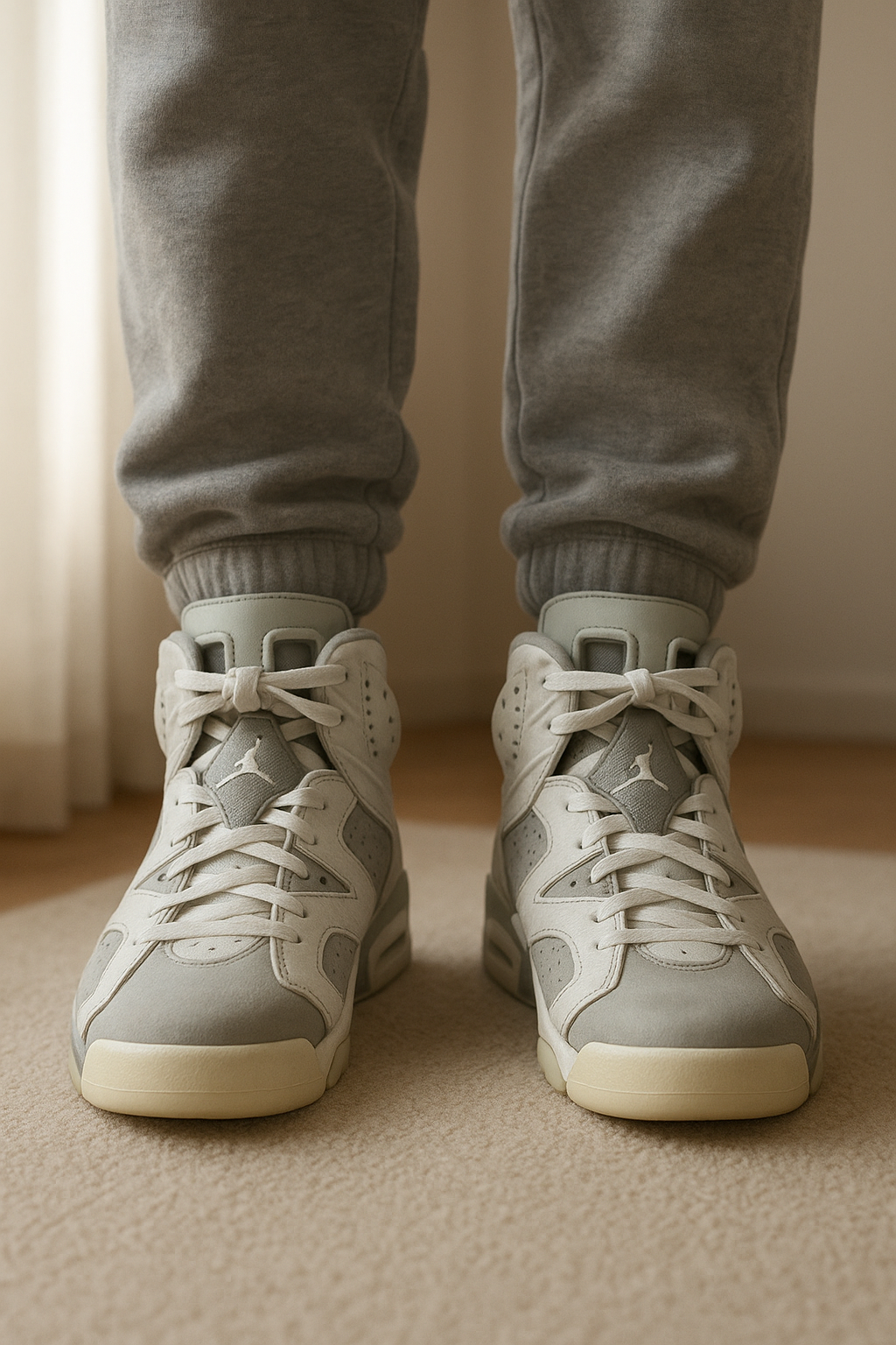 Jordan jumpman femme debout, face à la caméra, dans une chambre à la lumière douce, avec une lumière naturelle filtrant par la fenêtre.