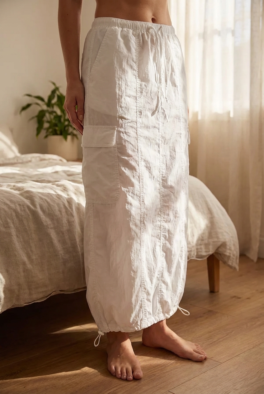 🤍 Jupe cargo Page One blanche midi debout, face à la caméra, dans une chambre à la lumière douce, avec une lumière naturelle filtrant par la fenêtre.