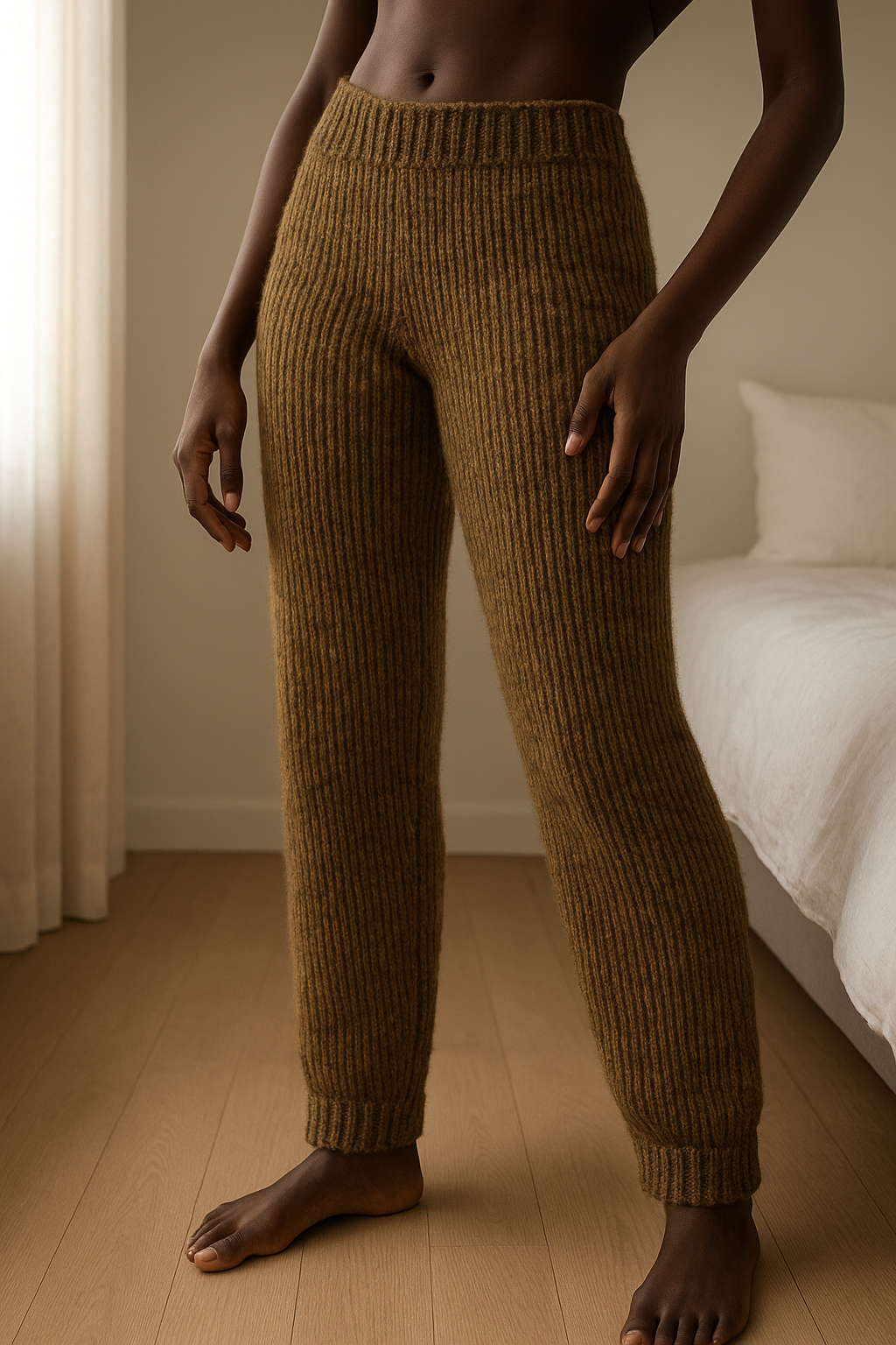 Une personne en jupe Chinée En Tricot Asymétrique T42 cambrant légèrement le dos pour une pose dynamique, dans une chambre à la lumière douce, avec une lumière naturelle filtrant par la fenêtre.