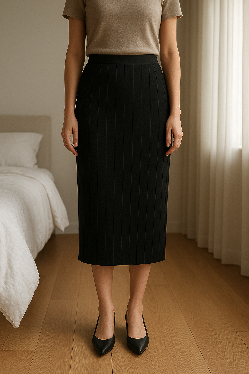 Jupe crayon noire ZARA - Dupe des jupes Maison Close - Taille M debout, face à la caméra, dans une chambre à la lumière douce, avec une lumière naturelle filtrant par la fenêtre.