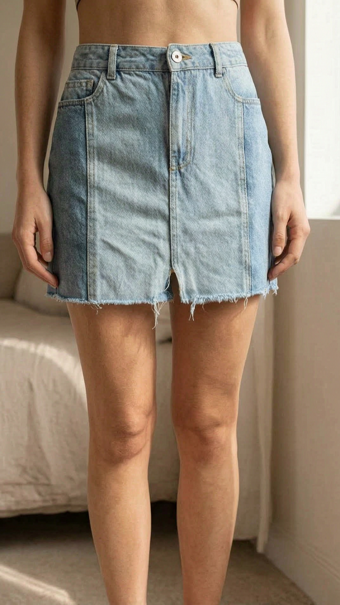 Jupe en jean en denim 34 - gonna Donna in piedi, rivolto verso la fotocamera, in una camera da letto con luce soffusa e luce naturale che filtra dalla finestra.