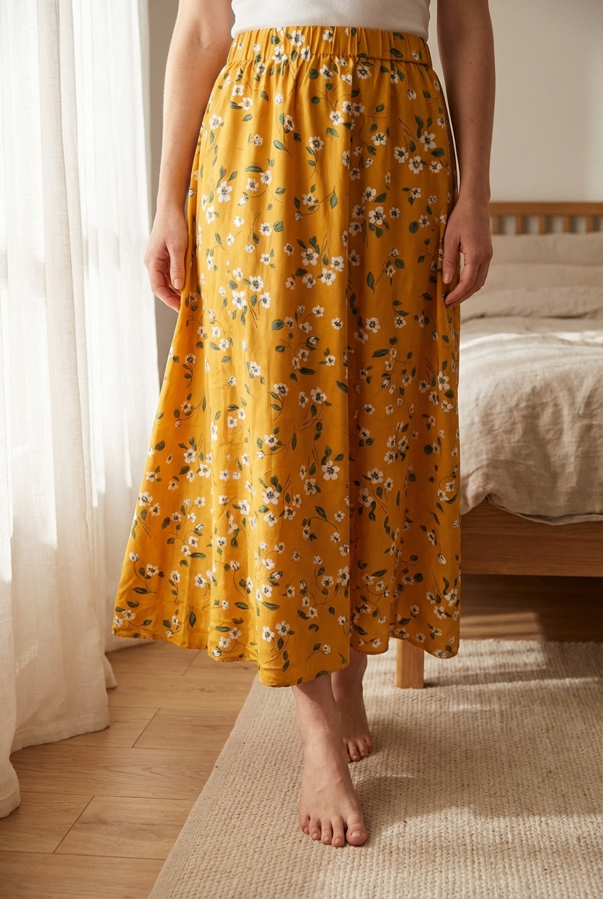 Une personne en Jupe longue avec de jolies fleurs, été debout, face à la caméra, dans une chambre à la lumière douce, avec une lumière naturelle filtrant par la fenêtre.