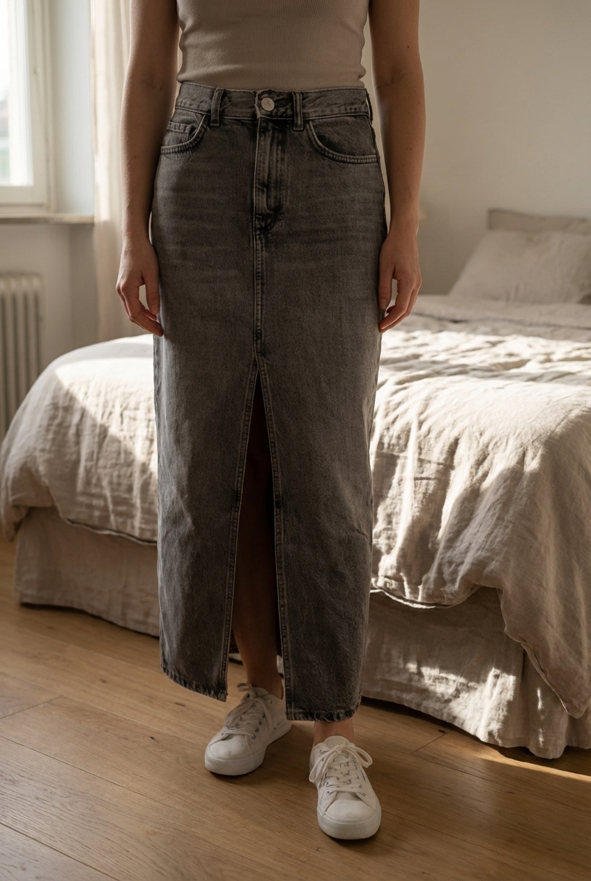 Jupe longue en jean grise Zara debout, face à la caméra, dans une chambre à la lumière douce, avec une lumière naturelle filtrant par la fenêtre.