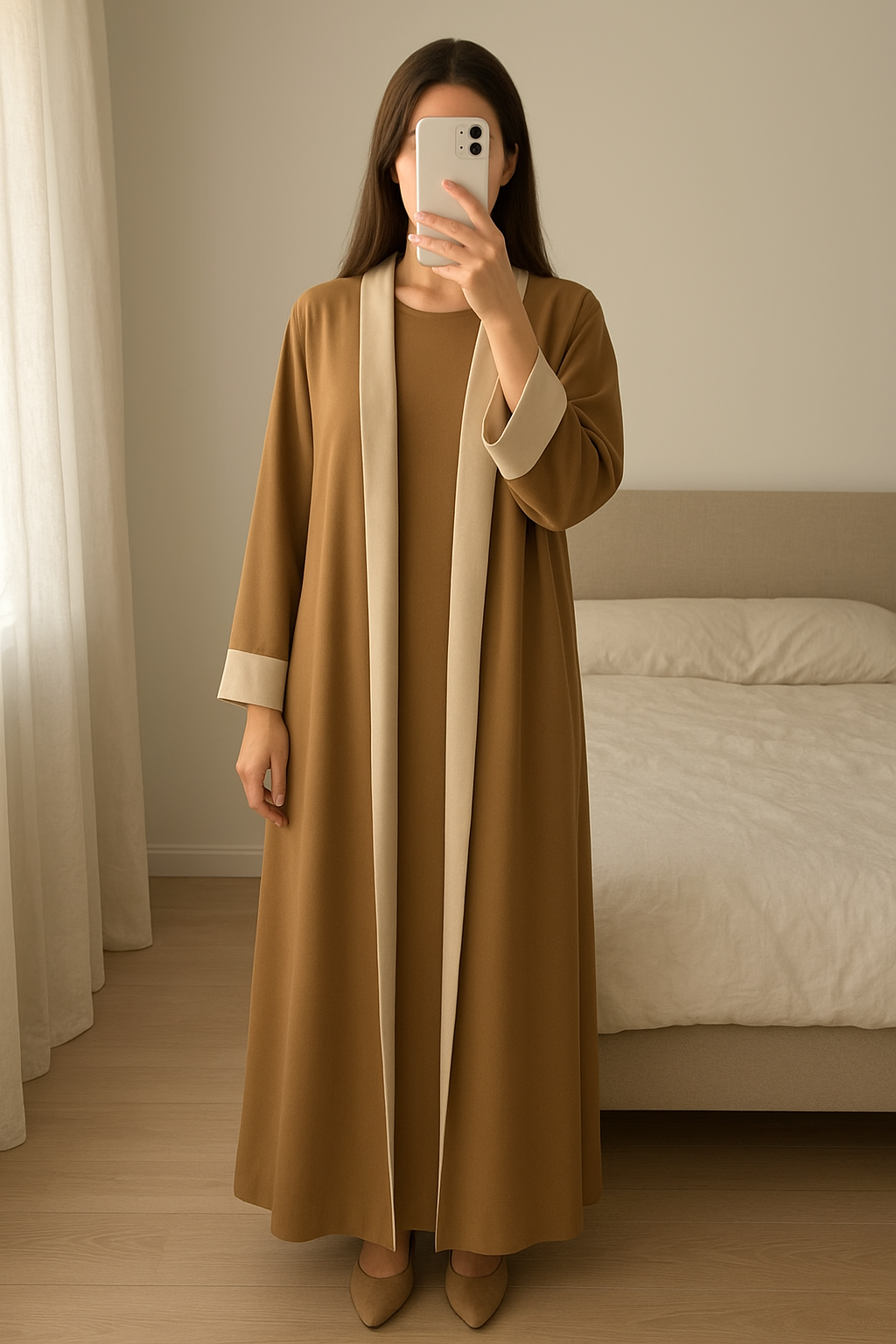 Kimono abaya beige taupe debout, face à la caméra, dans une chambre à la lumière douce, avec une lumière naturelle filtrant par la fenêtre.