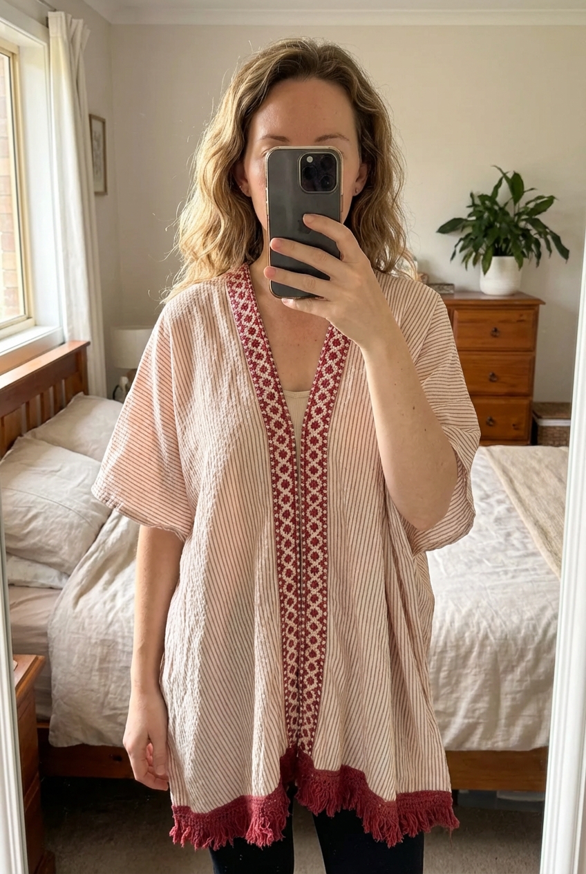 💗 Kimono court bohème à franges debout, face à la caméra, dans une chambre à la lumière douce, avec une lumière naturelle filtrant par la fenêtre.