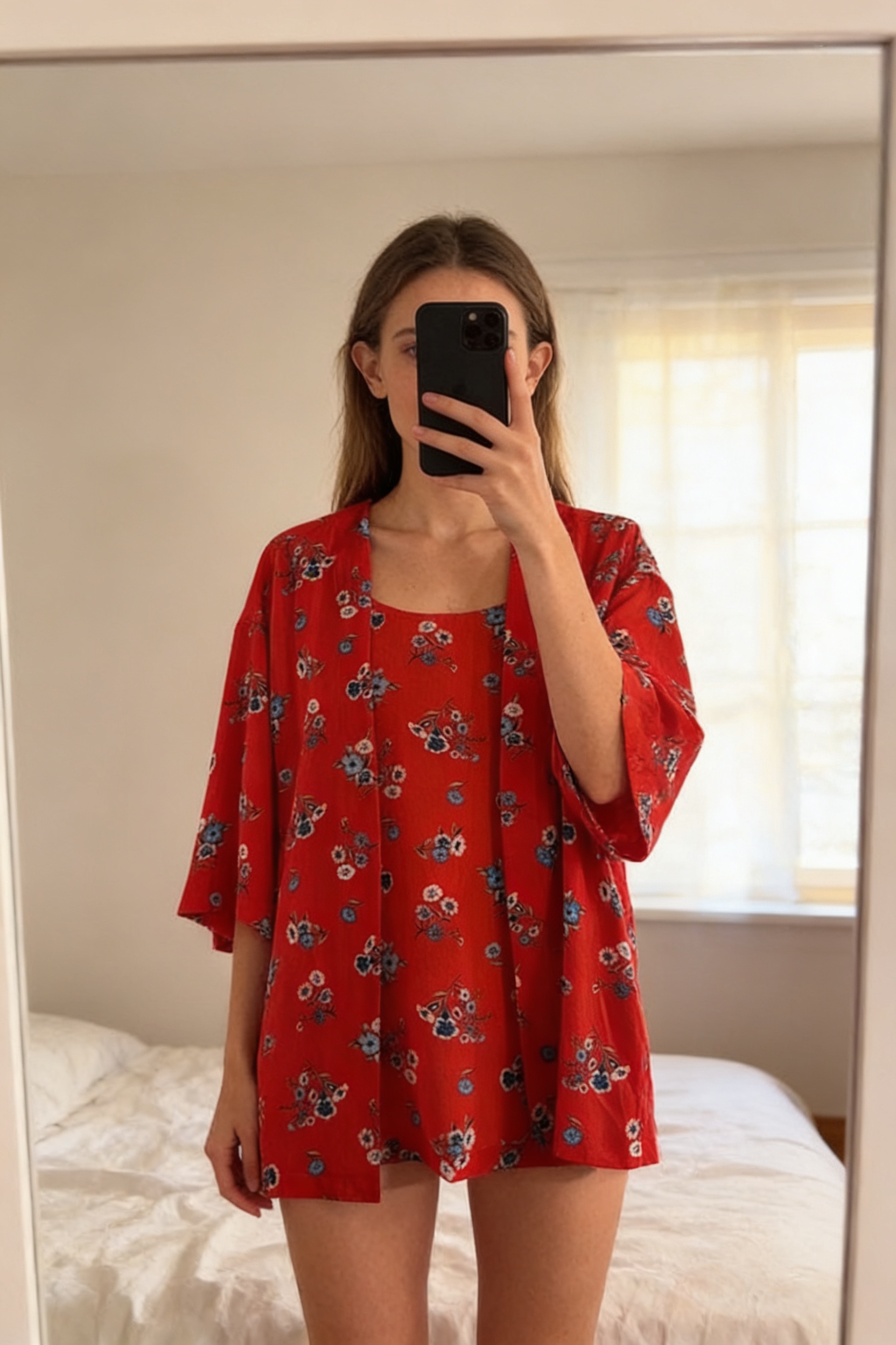Kimono rouge à motifs H&M XS in piedi, rivolto verso la fotocamera, in una camera da letto con luce soffusa e luce naturale che filtra dalla finestra.