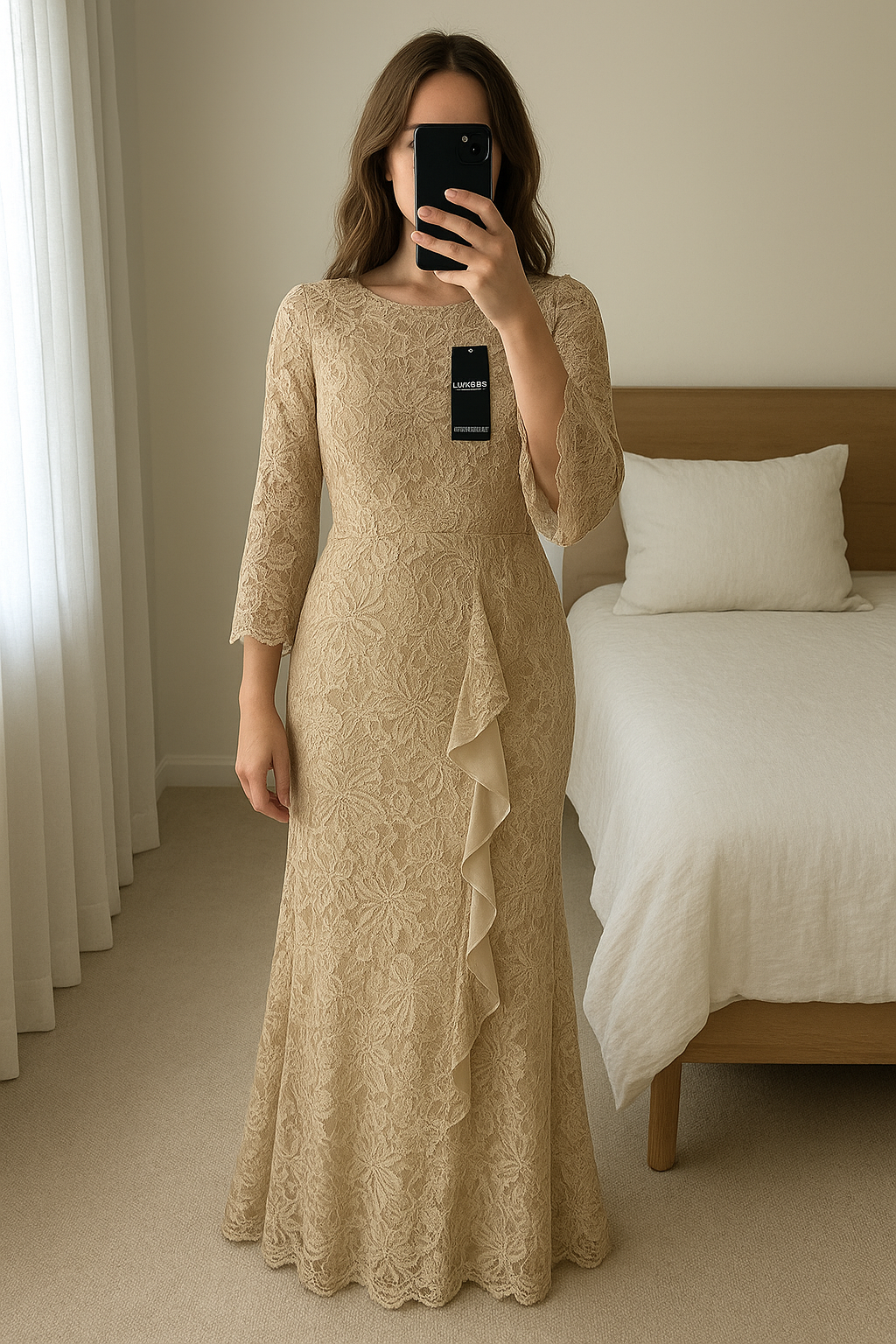 Lauren Ralph Lauren Lace Evening Gown – US 14 (UK 18) standing straight facing the camera, in a softly lit bedroom setting, with gentle natural light filtering through a window.