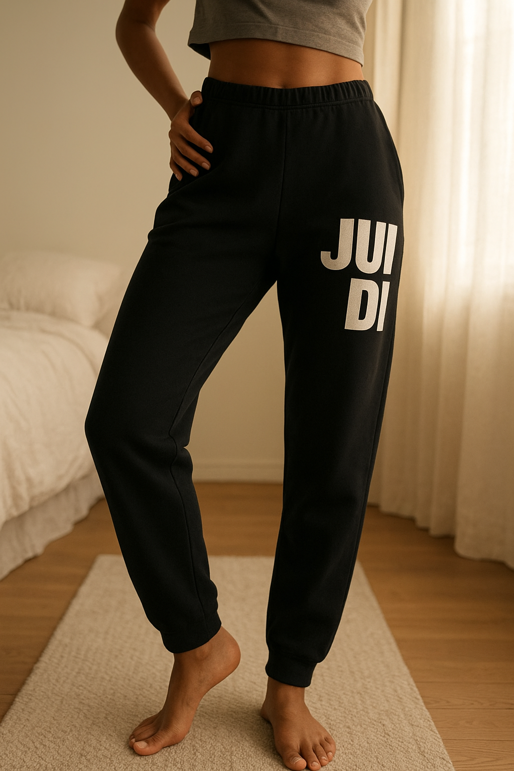 Une personne en Legging noir, Nike, S cambrant légèrement le dos pour une pose dynamique, dans une chambre à la lumière douce, avec une lumière naturelle filtrant par la fenêtre.
