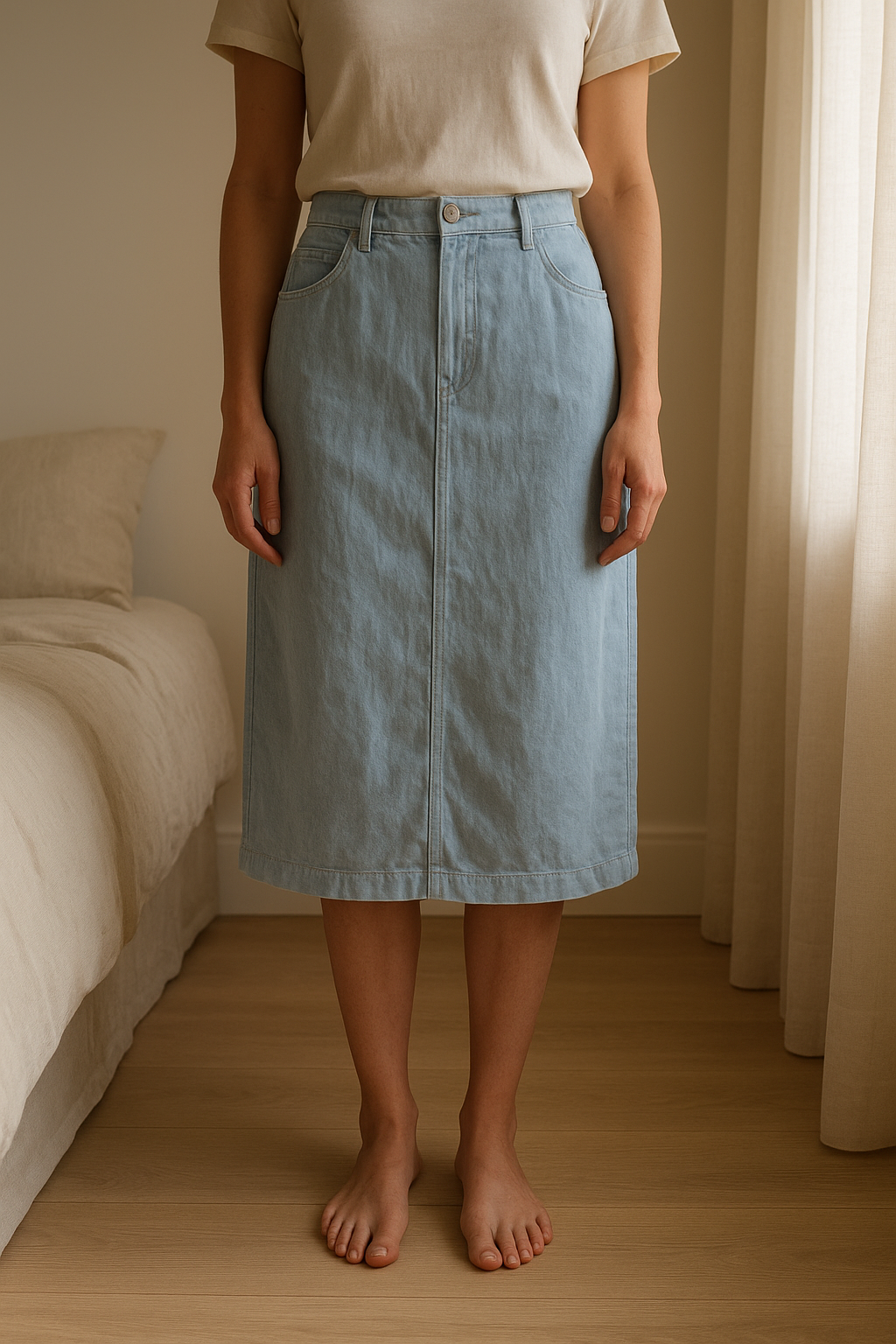 Linnen Rok Xandres - maat 36 debout, face à la caméra, dans une chambre à la lumière douce, avec une lumière naturelle filtrant par la fenêtre.