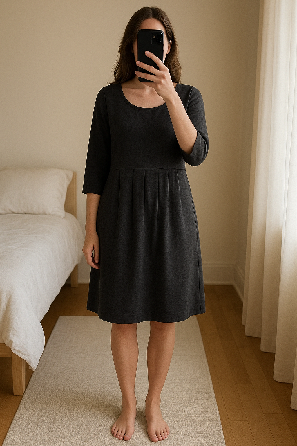 Little black dress abito corto nero Esmara con schiena pieghettata in piedi, rivolto verso la fotocamera, in una camera da letto con luce soffusa e luce naturale che filtra dalla finestra.