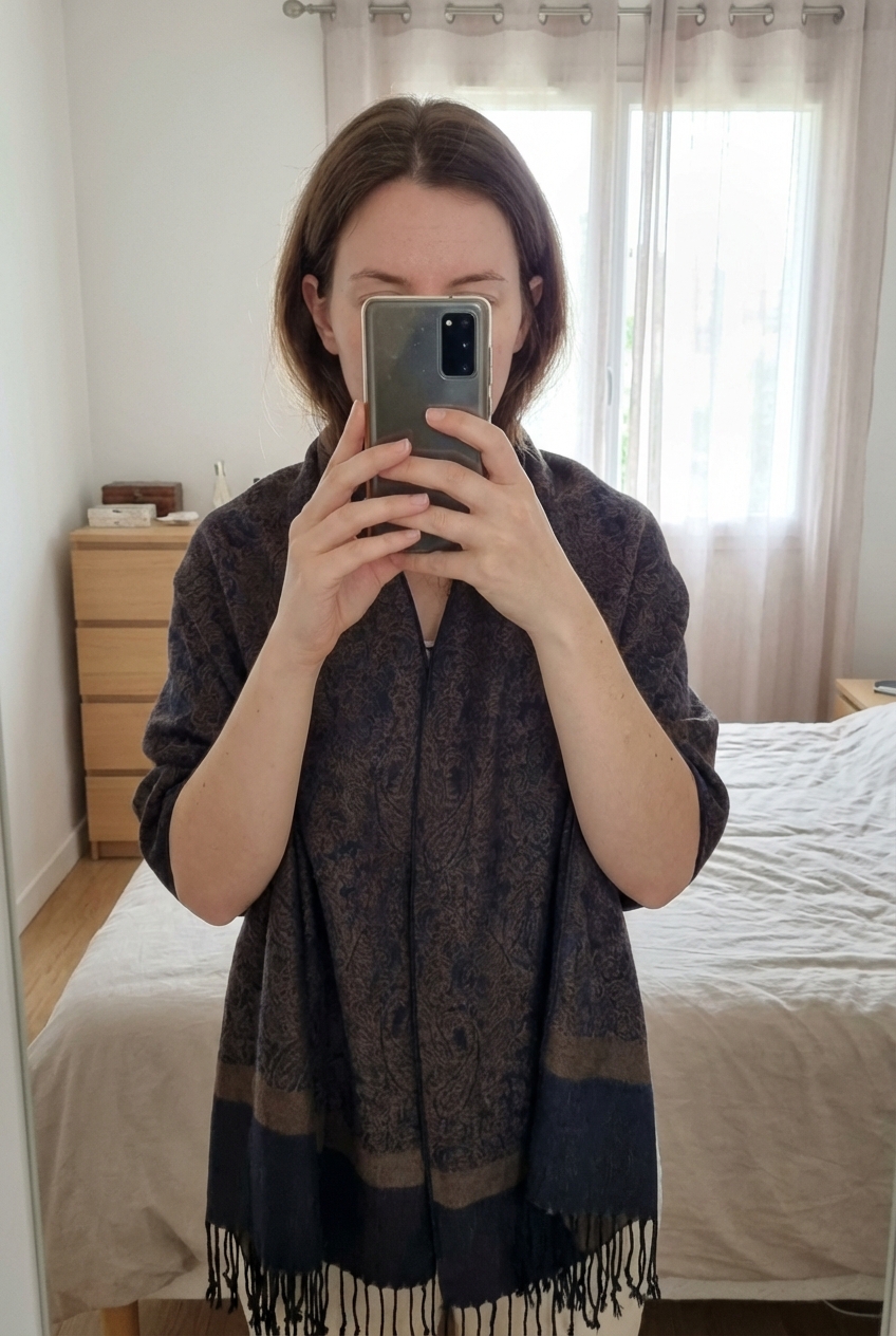 Longue et large étole ou écharpe laine et soie neuve debout, face à la caméra, dans une chambre à la lumière douce, avec une lumière naturelle filtrant par la fenêtre.