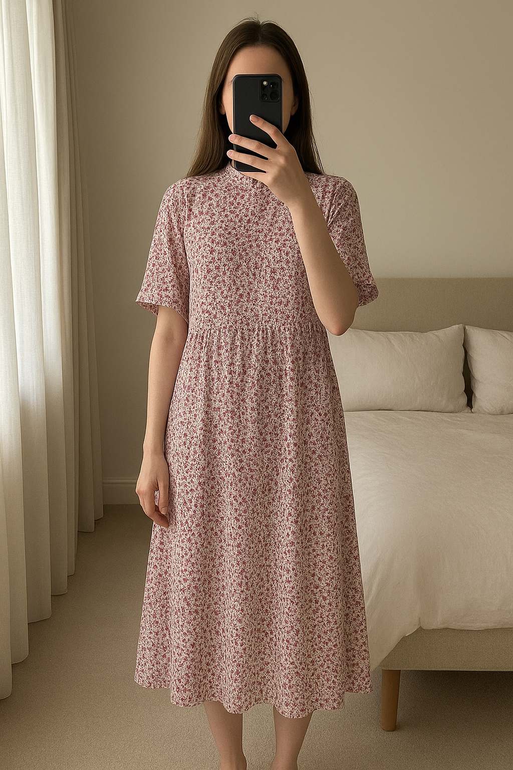 Longue robe coréenne oversize plissée motifs fleurs rose et blanche debout, face à la caméra, dans une chambre à la lumière douce, avec une lumière naturelle filtrant par la fenêtre.