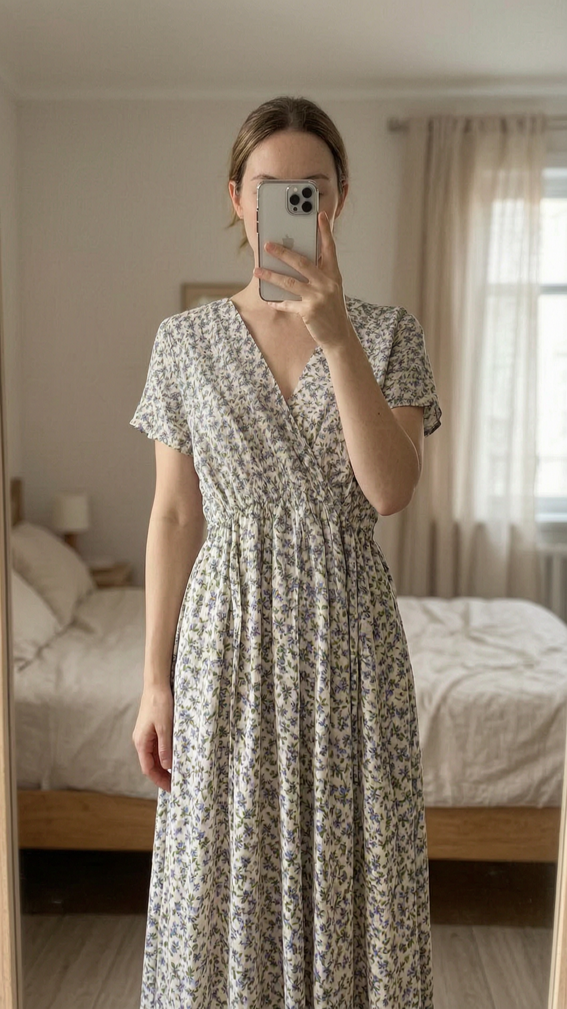 Longue robe femme à fleurs M - Abito lungo donna estate in piedi, rivolto verso la fotocamera, in una camera da letto con luce soffusa e luce naturale che filtra dalla finestra.