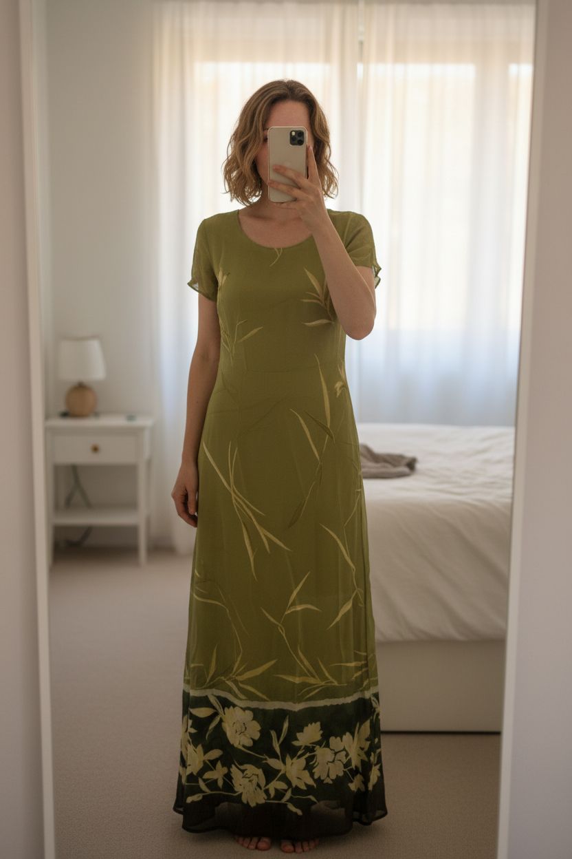 Longue robe femme verte M Abito lungo donna M in piedi, rivolto verso la fotocamera, in una camera da letto con luce soffusa e luce naturale che filtra dalla finestra.