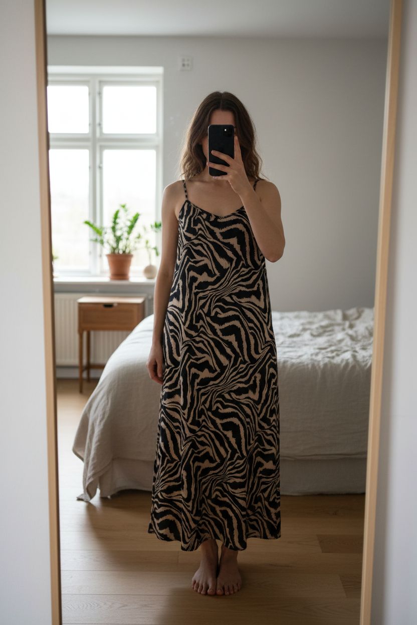 Longue robe à motifs été M - Abito estivo lungo donna e in piedi, rivolto verso la fotocamera, in una camera da letto con luce soffusa e luce naturale che filtra dalla finestra.