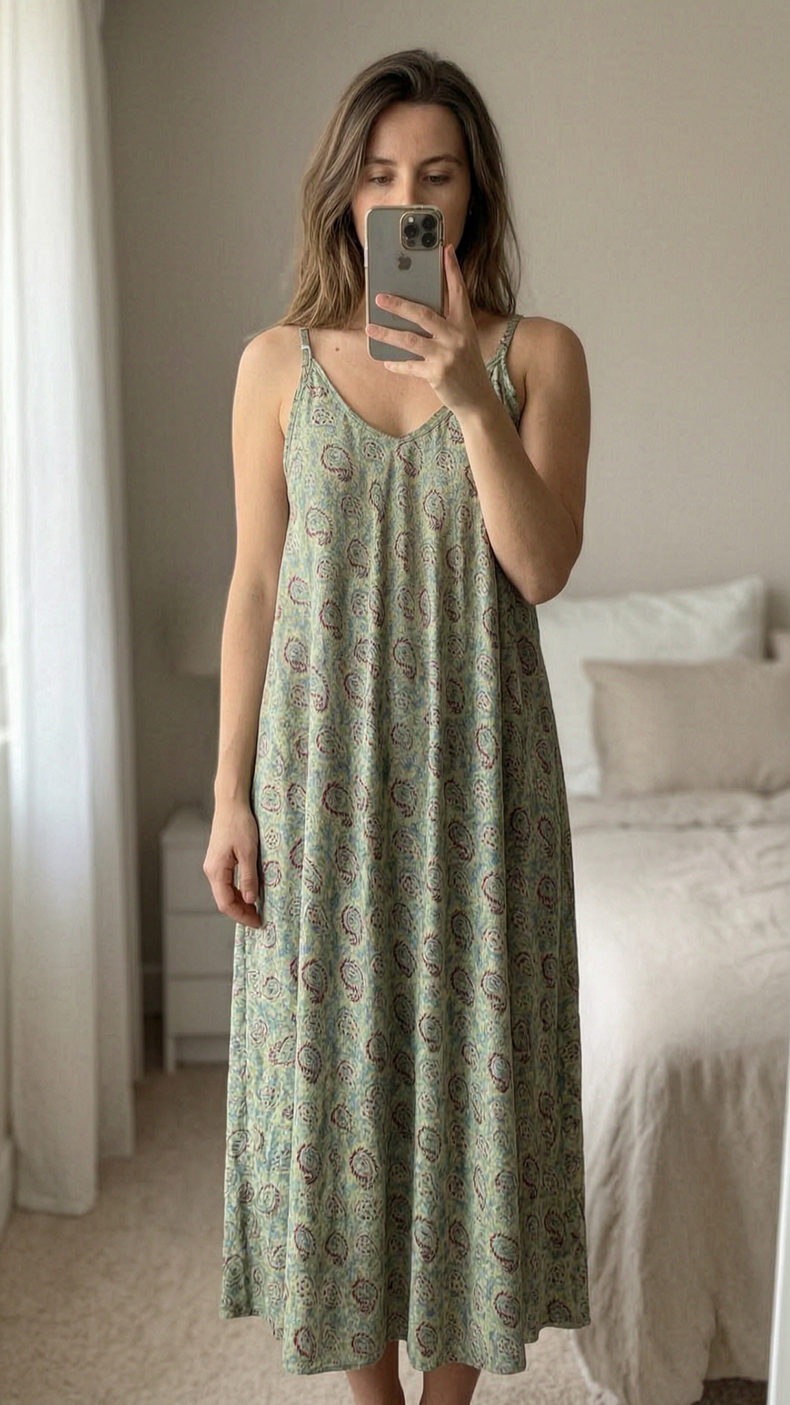 Longue robe été Ipanima - Abito lungo L / XL in piedi, rivolto verso la fotocamera, in una camera da letto con luce soffusa e luce naturale che filtra dalla finestra.