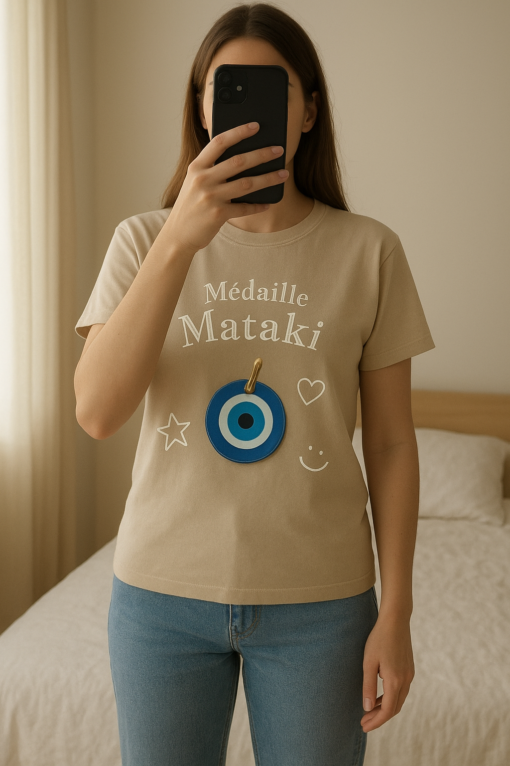 Médaille pour chien debout, face à la caméra, dans une chambre à la lumière douce, avec une lumière naturelle filtrant par la fenêtre.