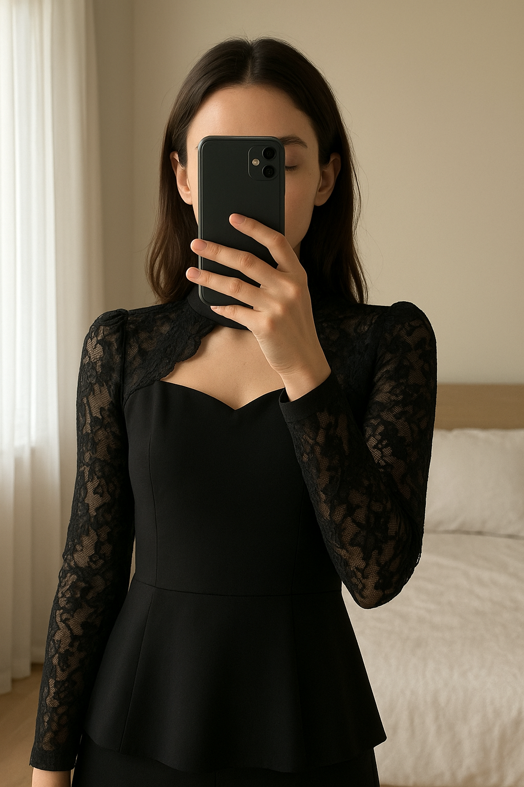 Maglia nera elegante con pizzo su maniche, spalle e collo in piedi, rivolto verso la fotocamera, in una camera da letto con luce soffusa e luce naturale che filtra dalla finestra.