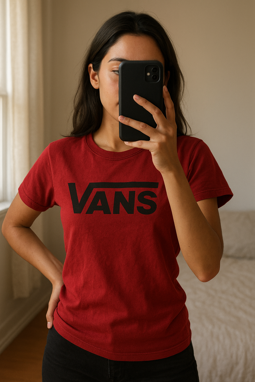 Una persona in Maglietta vans inarcando leggermente la schiena per una posa dinamica, con corporatura snella, in una camera da letto con luce soffusa e luce naturale che filtra dalla finestra.