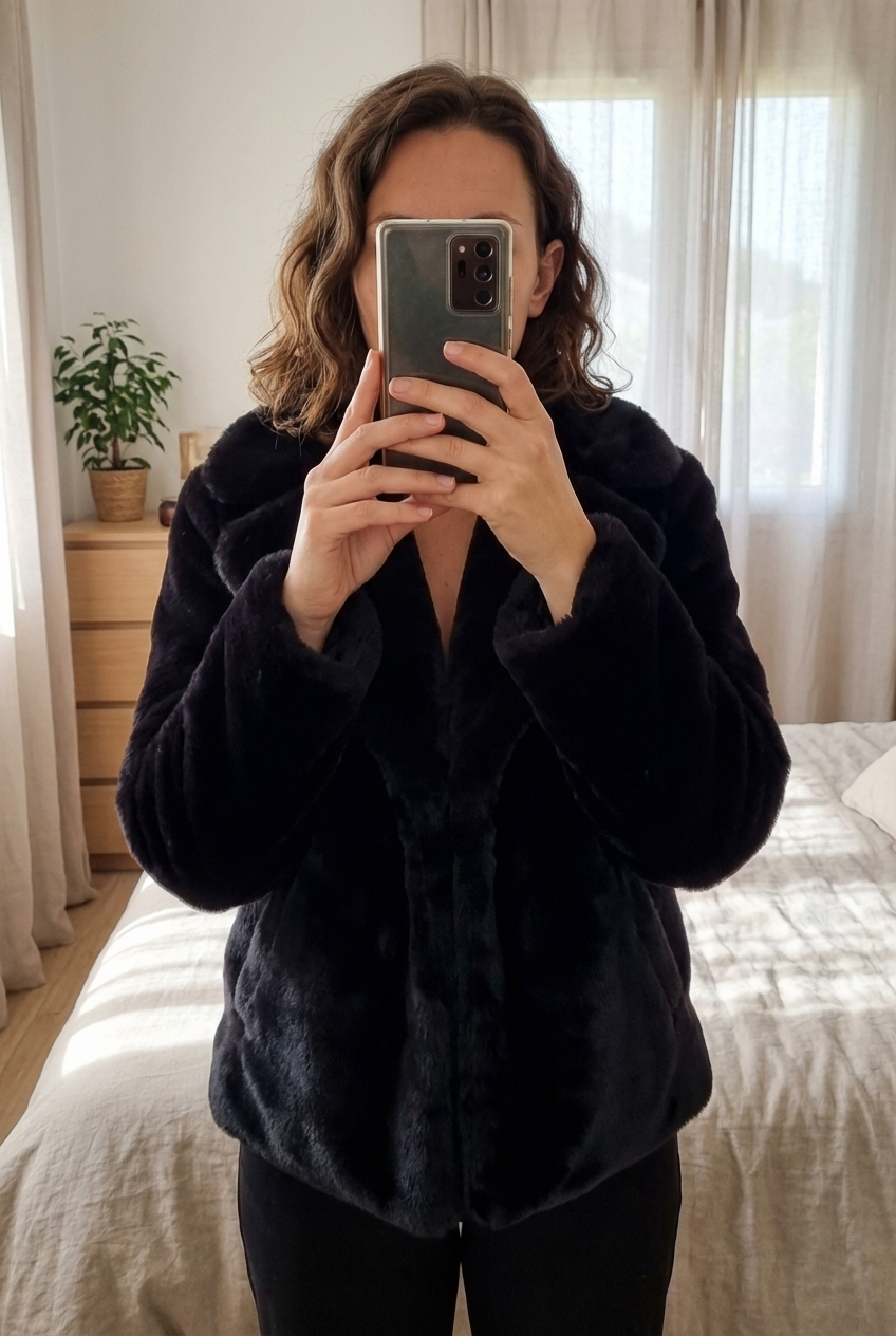 Une personne en Magnifique manteau en fausse fourrure noire – chaud et élégant debout, face à la caméra, dans une chambre à la lumière douce, avec une lumière naturelle filtrant par la fenêtre.