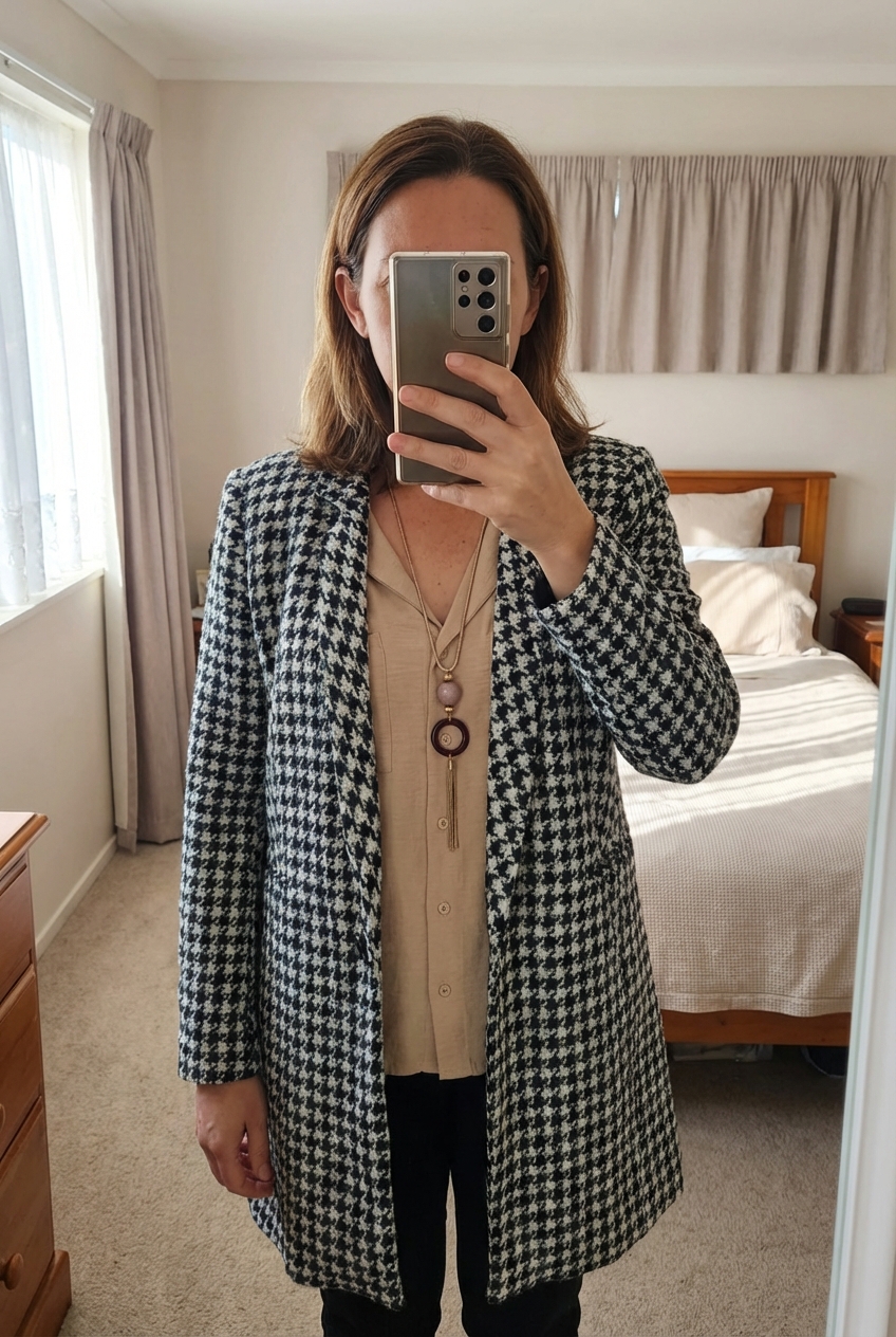 Une personne en Magnifique manteau pied-de-poule noir et blanc – chic et intemporel debout, face à la caméra, dans une chambre à la lumière douce, avec une lumière naturelle filtrant par la fenêtre.