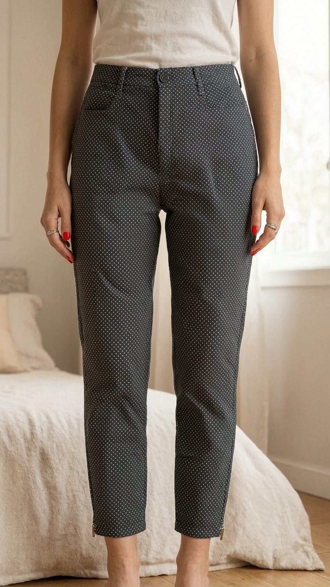 Magnifique pantalon à pois 38 More & More - pantalone donna M in piedi, rivolto verso la fotocamera, in una camera da letto con luce soffusa e luce naturale che filtra dalla finestra.