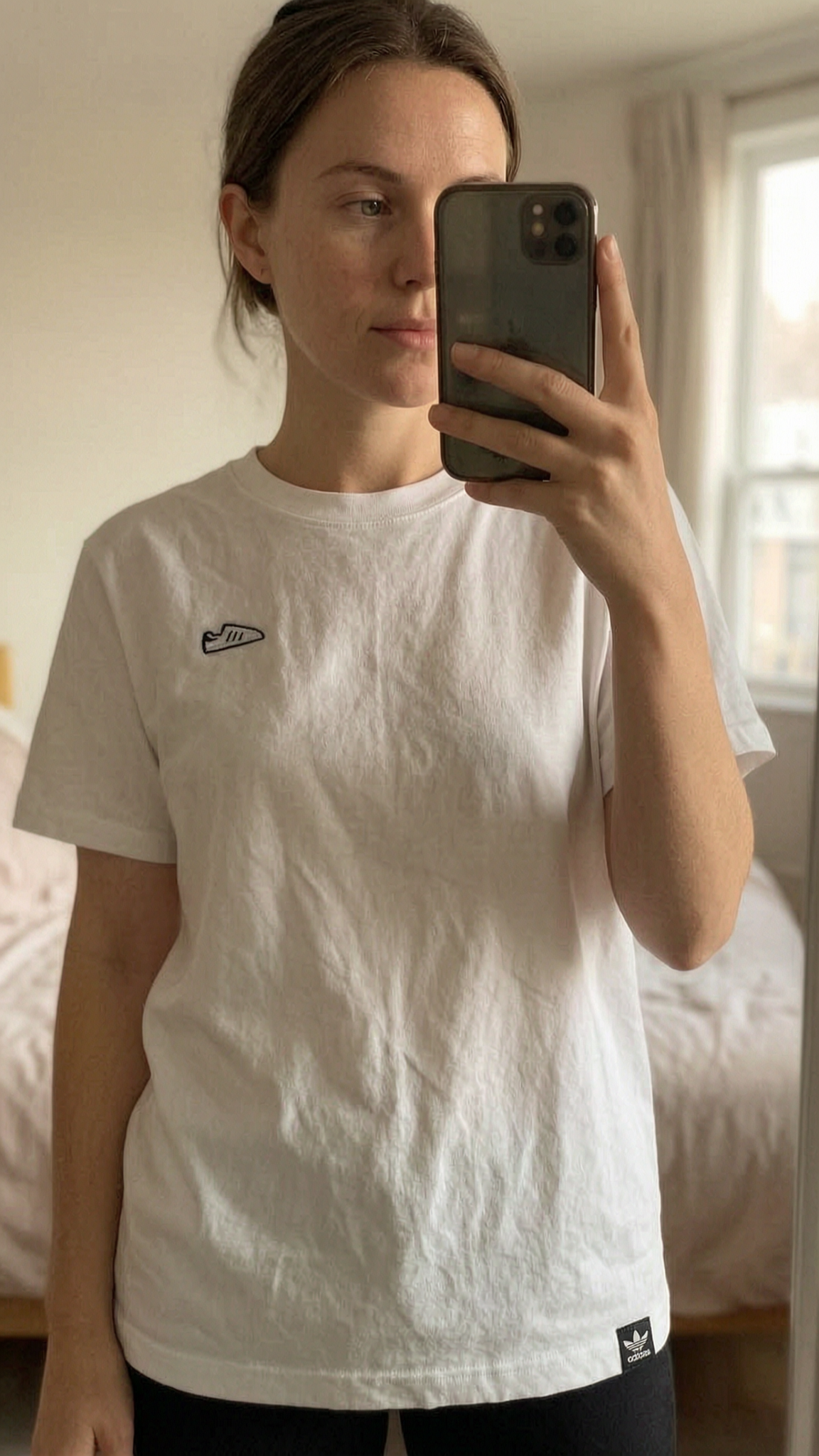 Magnifique t-shirt adidas blanc M - Maglietta T-shirt adidas Donna M in piedi, rivolto verso la fotocamera, in una camera da letto con luce soffusa e luce naturale che filtra dalla finestra.