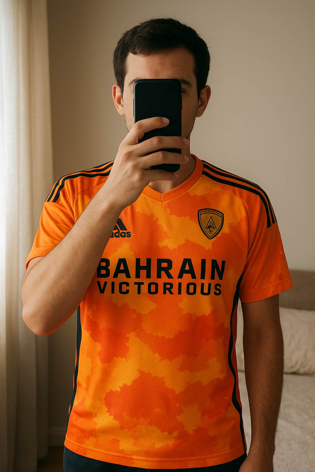 maillot de paris fc debout, face à la caméra, dans une chambre à la lumière douce, avec une lumière naturelle filtrant par la fenêtre.