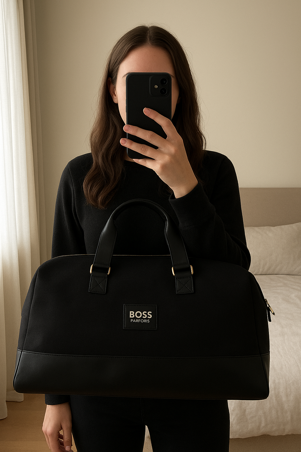 Mala Boss em pé, de frente para a câmera, em um quarto com iluminação suave e luz natural filtrando pela janela.