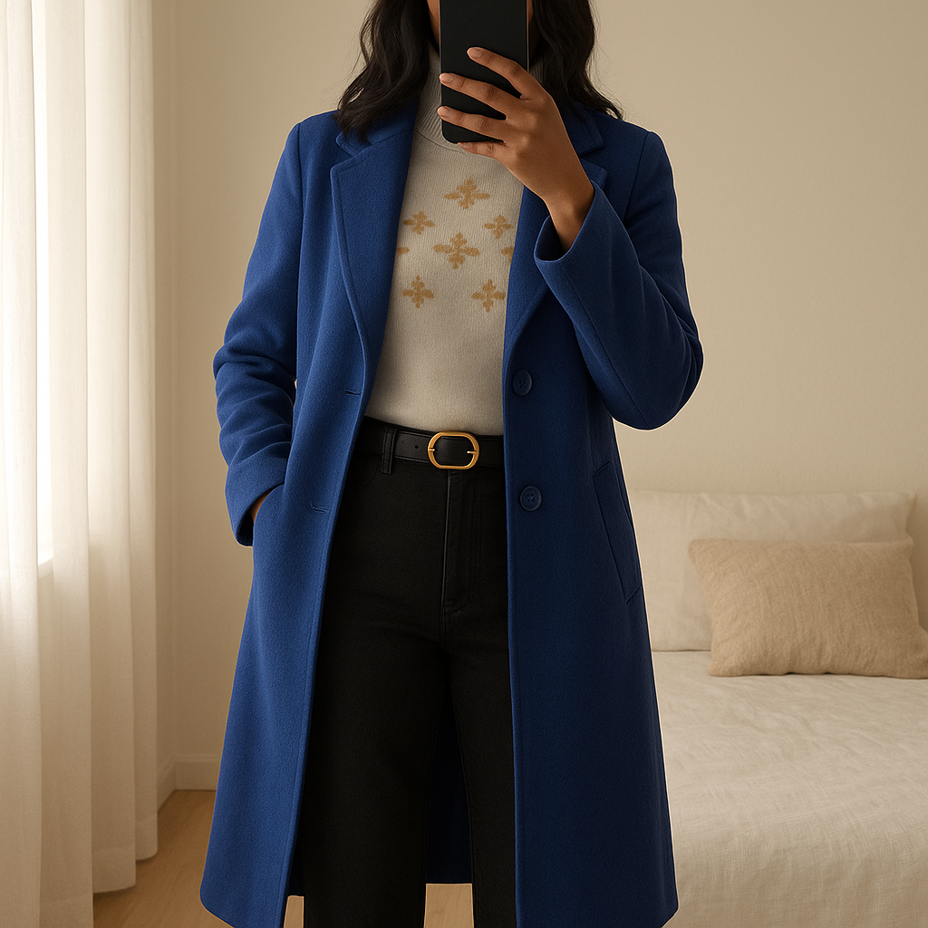 Manteau d'hiver debout, face à la caméra, dans une chambre à la lumière douce, avec une lumière naturelle filtrant par la fenêtre.