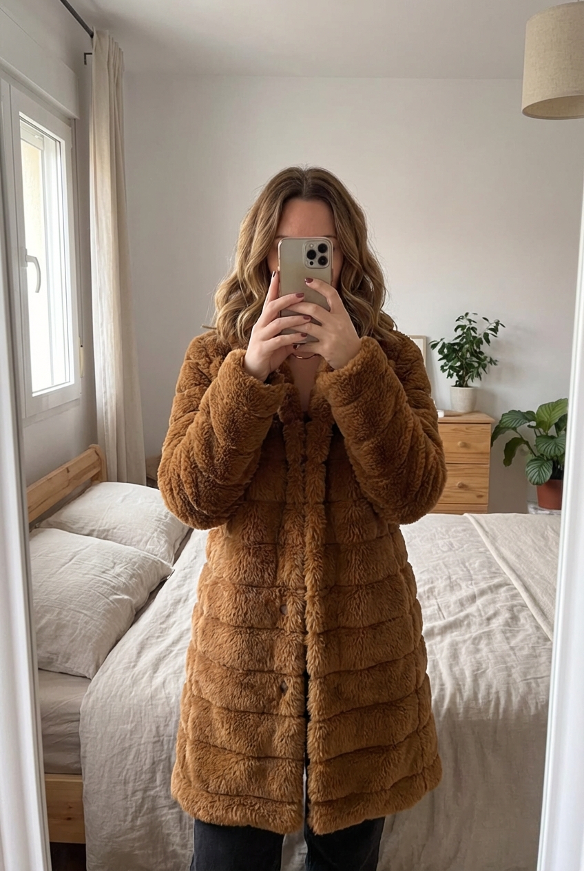 Manteau fourrure debout, face à la caméra, dans une chambre à la lumière douce, avec une lumière naturelle filtrant par la fenêtre.