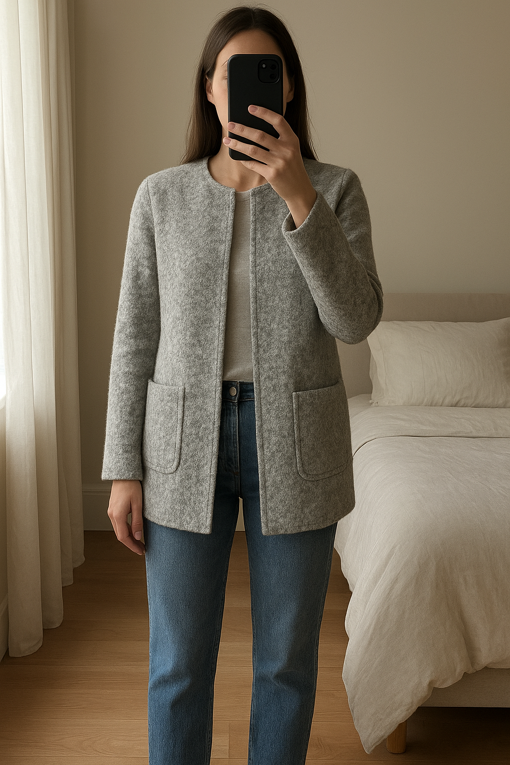 Manteau long en laine Only taille 36/38 debout, face à la caméra, dans une chambre à la lumière douce, avec une lumière naturelle filtrant par la fenêtre.