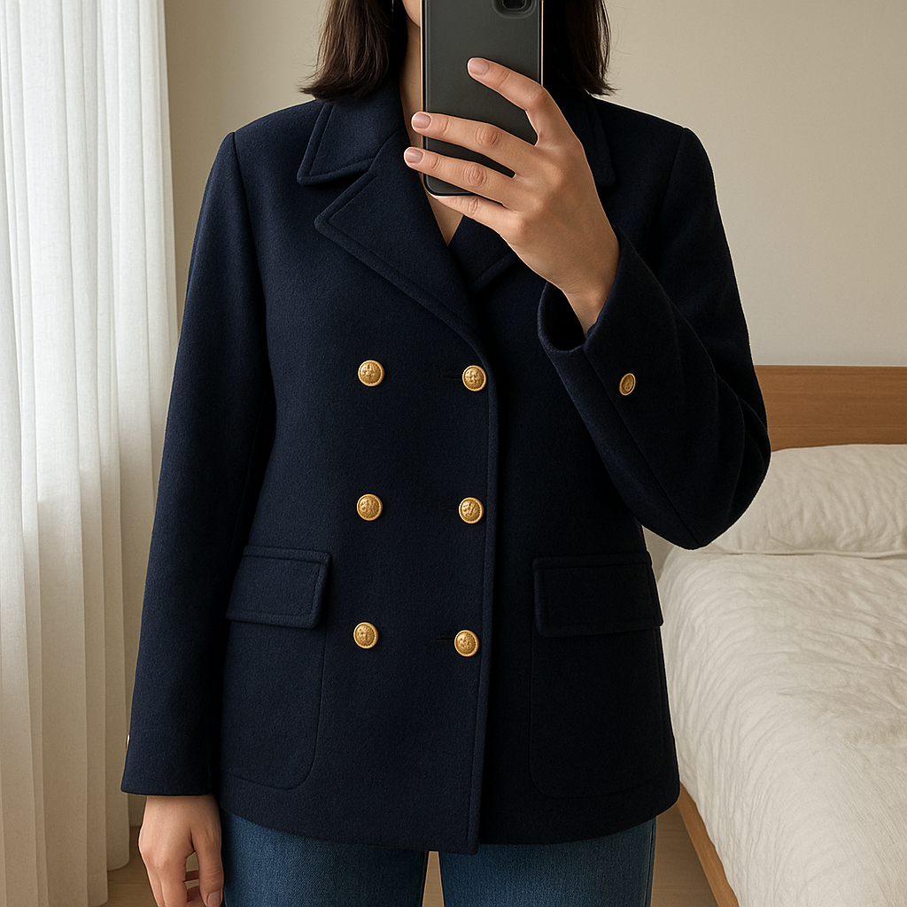 Manteau Marin Michel Beaudoin debout, face à la caméra, dans une chambre à la lumière douce, avec une lumière naturelle filtrant par la fenêtre.