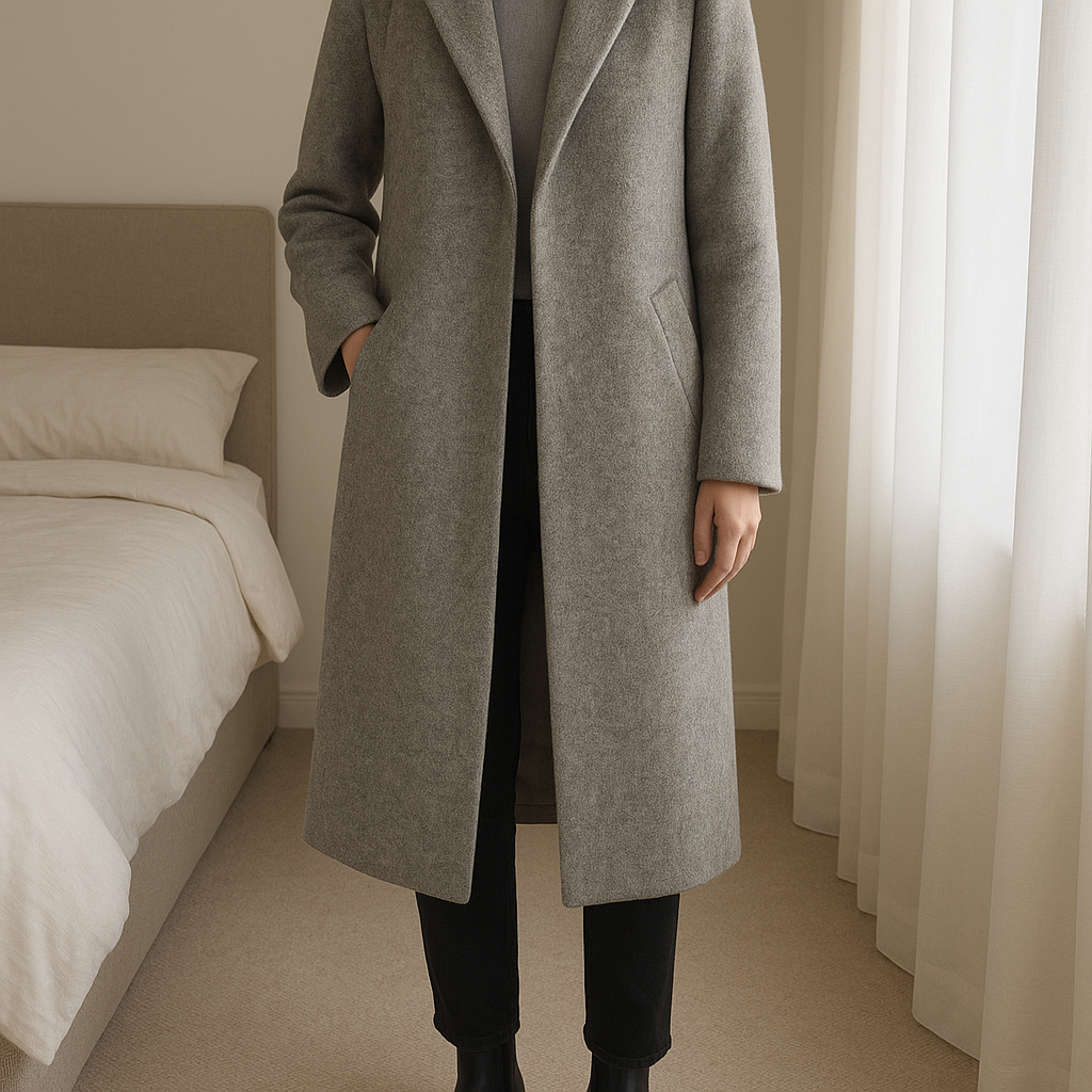 Manteau New Look long gris taille S debout, face à la caméra, dans une chambre à la lumière douce, avec une lumière naturelle filtrant par la fenêtre.