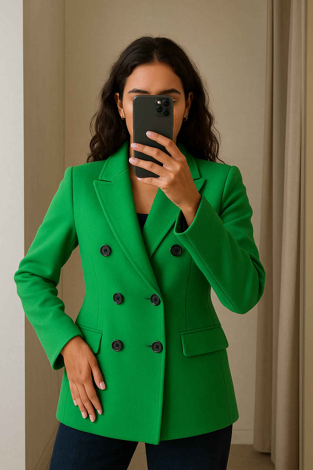 Une personne en Manteau Zara cambrant légèrement le dos pour une pose dynamique, dans une cabine d’essayage de style boutique avec un miroir et une décoration neutre.