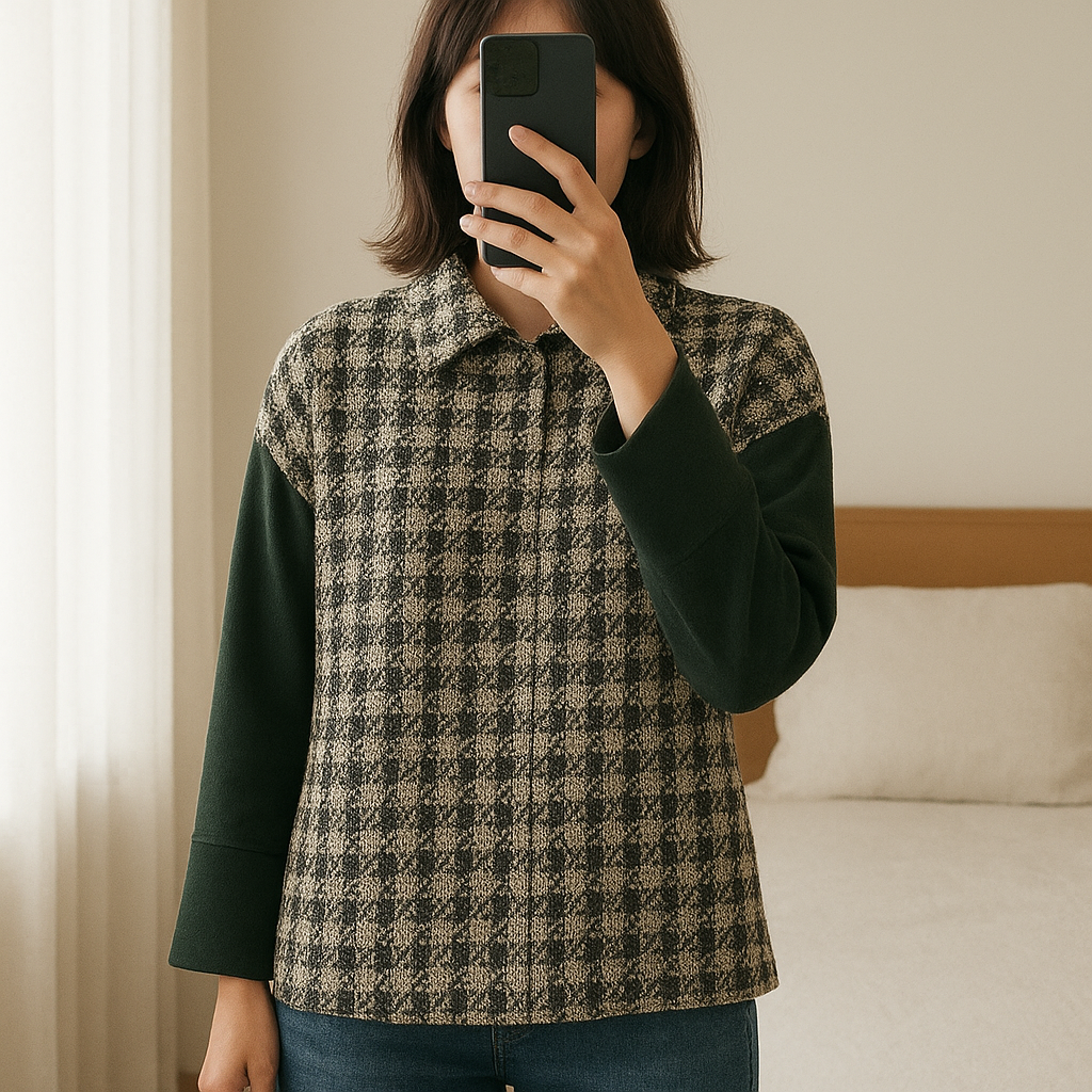 Mantella donna pied-de-poule – Taglia L, stile senza tempo in piedi, rivolto verso la fotocamera, in una camera da letto con luce soffusa e luce naturale che filtra dalla finestra.