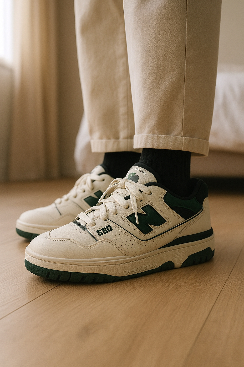 New Balance 550 in piedi, rivolto verso la fotocamera, in una camera da letto con luce soffusa e luce naturale che filtra dalla finestra.