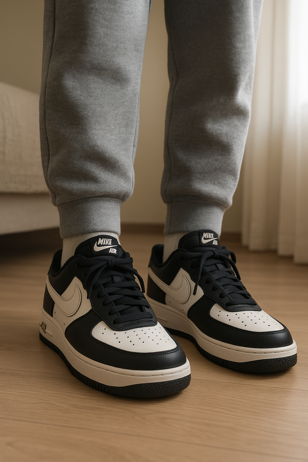 Nike Air force 1 debout, face à la caméra, dans une chambre à la lumière douce, avec une lumière naturelle filtrant par la fenêtre.