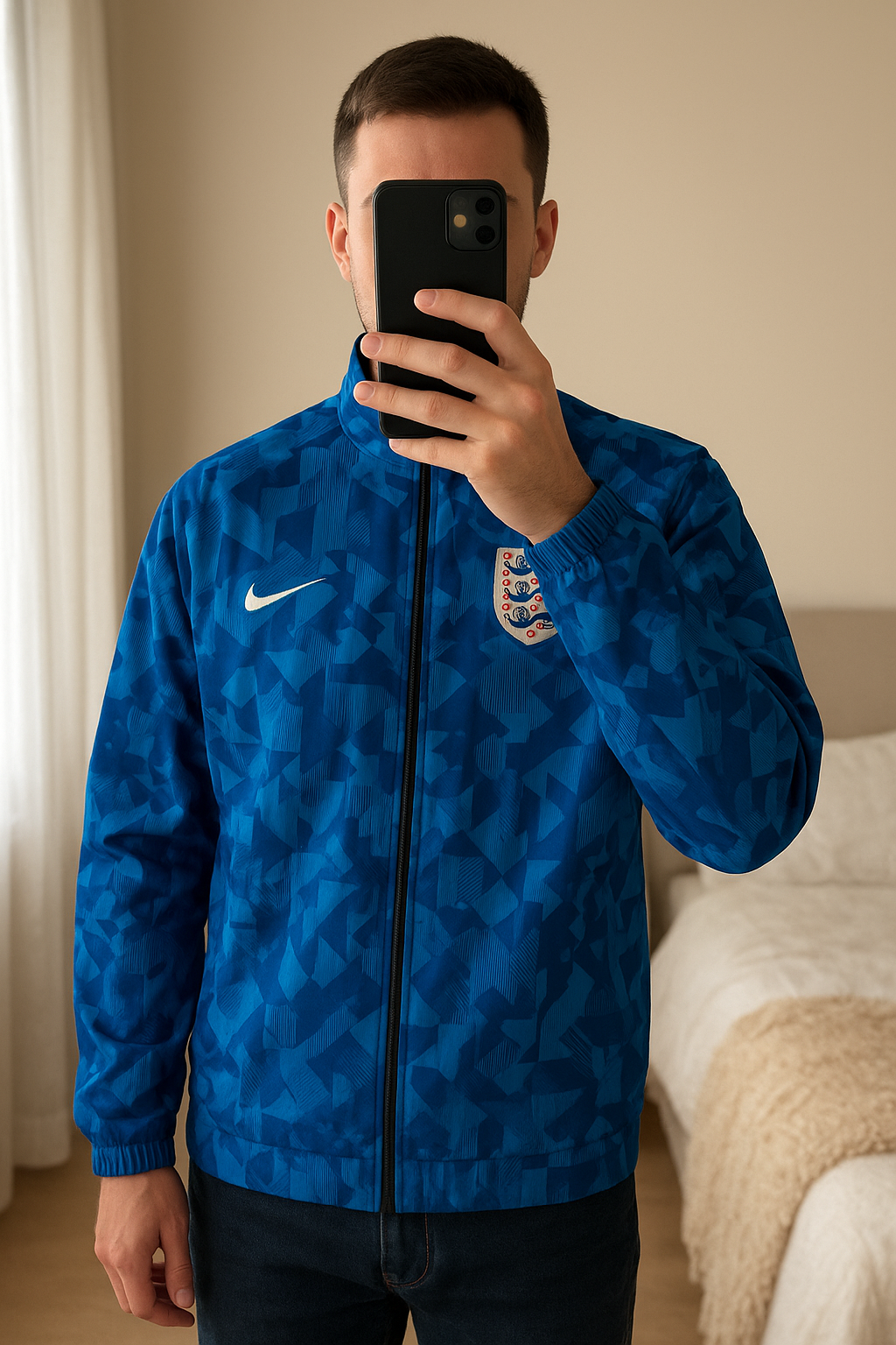Nike Giacca a Vento Reversibile Inghilterra 2024/2025 Taglia M Football Style in piedi, rivolto verso la fotocamera, in una camera da letto con luce soffusa e luce naturale che filtra dalla finestra.