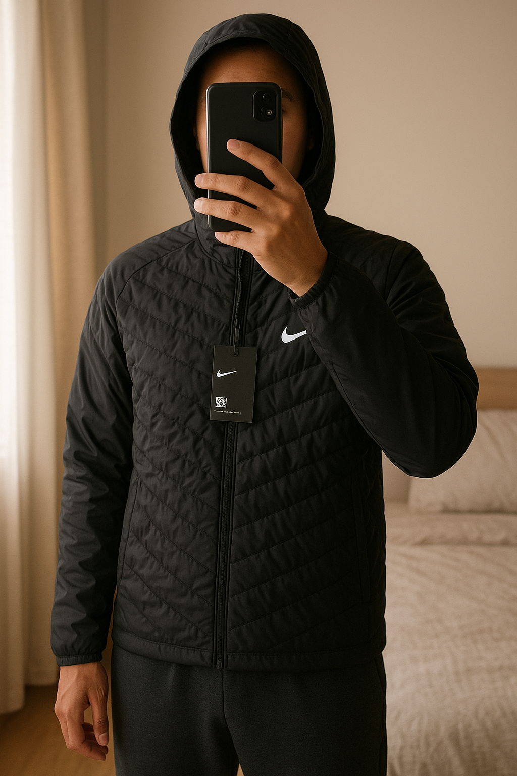 Nike therma fit adv debout, face à la caméra, dans une chambre à la lumière douce, avec une lumière naturelle filtrant par la fenêtre.