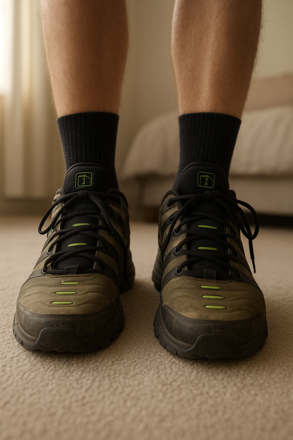 Nike Vapor Air Max plus mens UK7 standing straight facing the camera, in a softly lit bedroom setting, with gentle natural light filtering through a window.