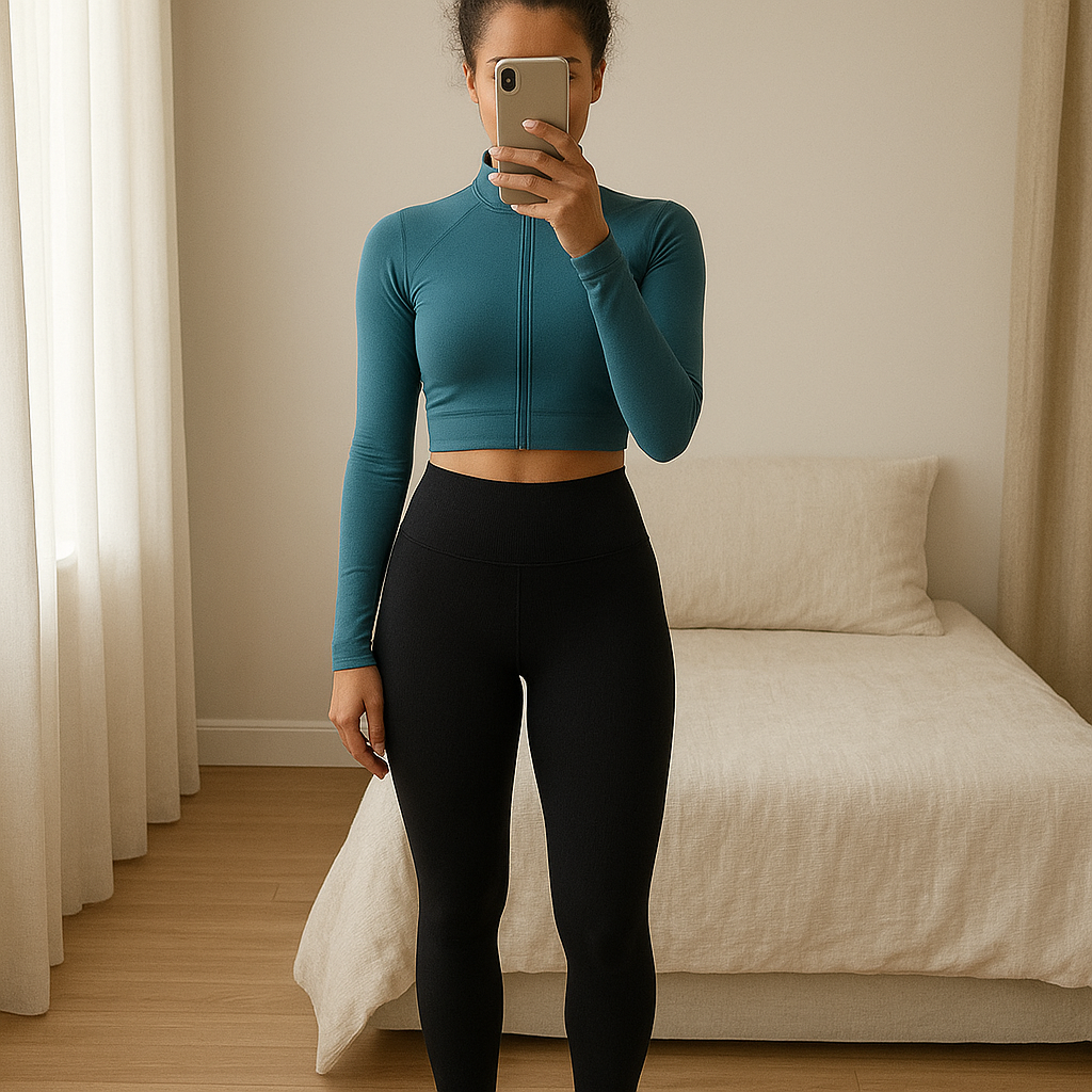 Offre duo legging noir +veste bleu debout, face à la caméra, dans une chambre à la lumière douce, avec une lumière naturelle filtrant par la fenêtre.