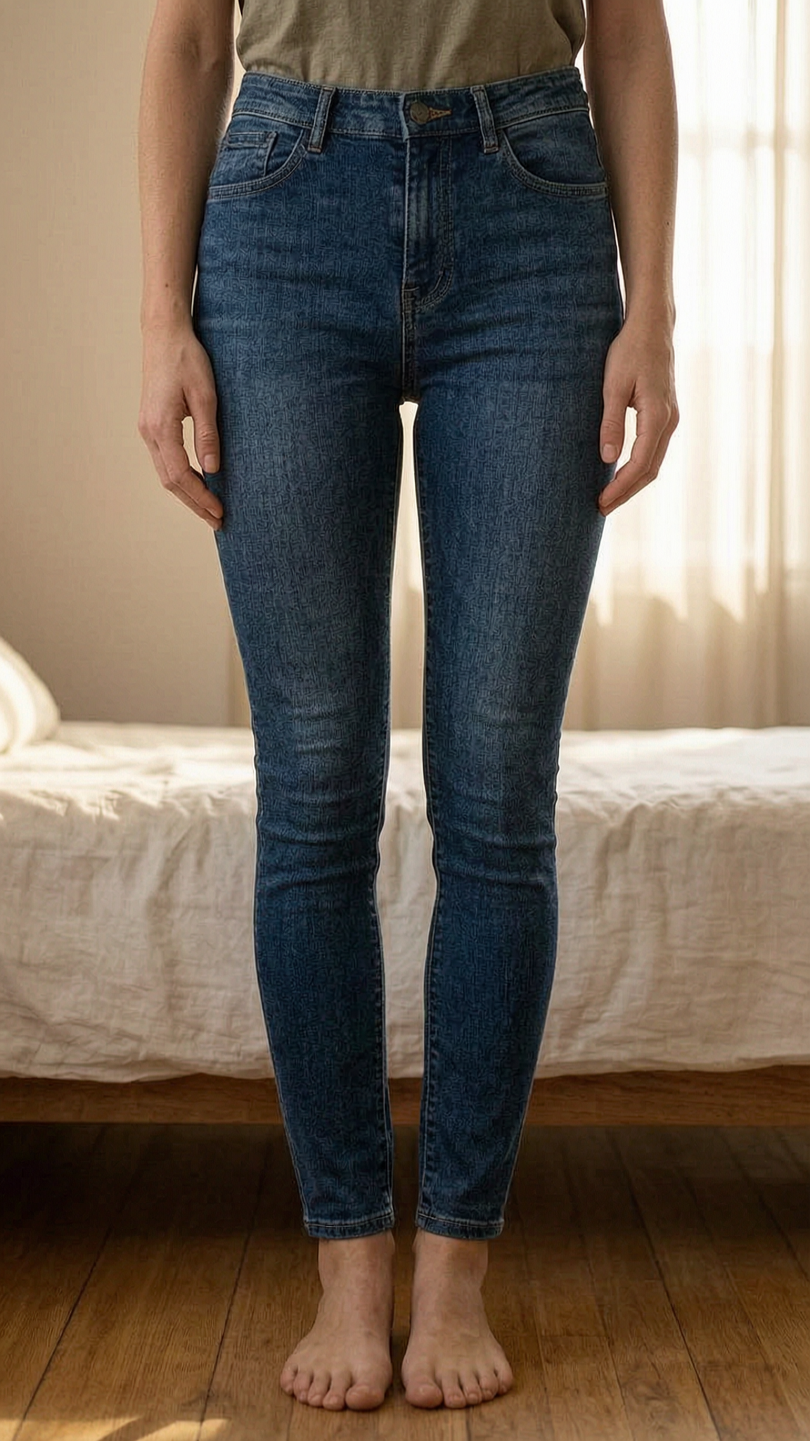 Only Jeans donna in piedi, rivolto verso la fotocamera, in una camera da letto con luce soffusa e luce naturale che filtra dalla finestra.