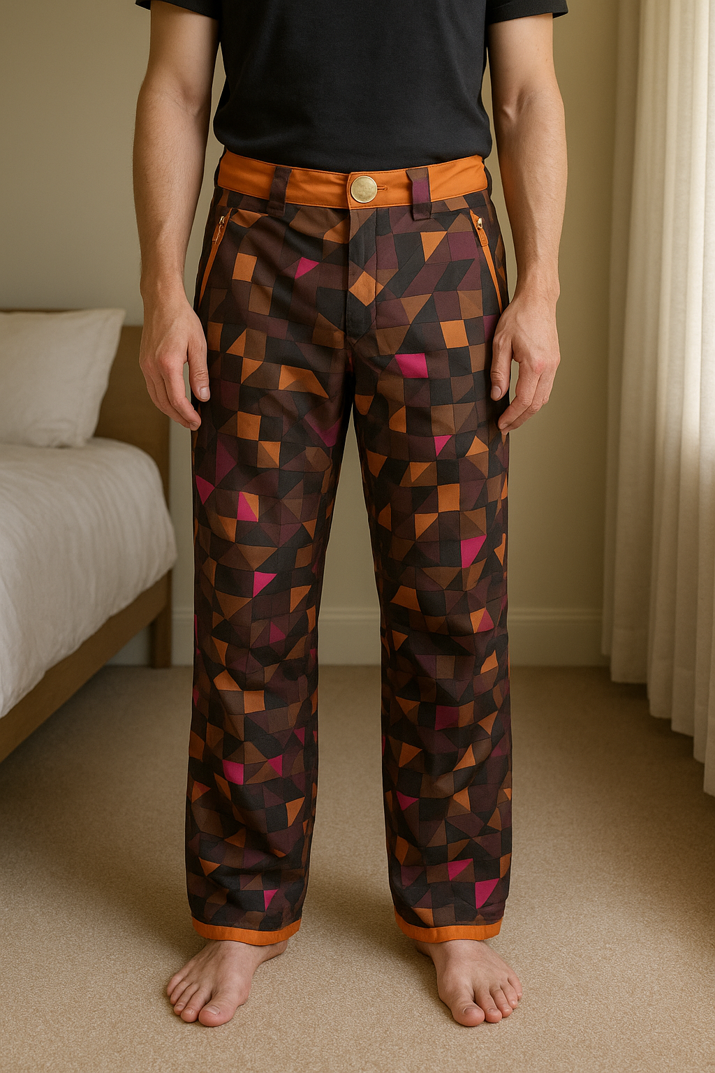 Pantalón esqui Rossignol de pie, mirando a la cámara, en un dormitorio con luz suave y natural filtrándose por la ventana.