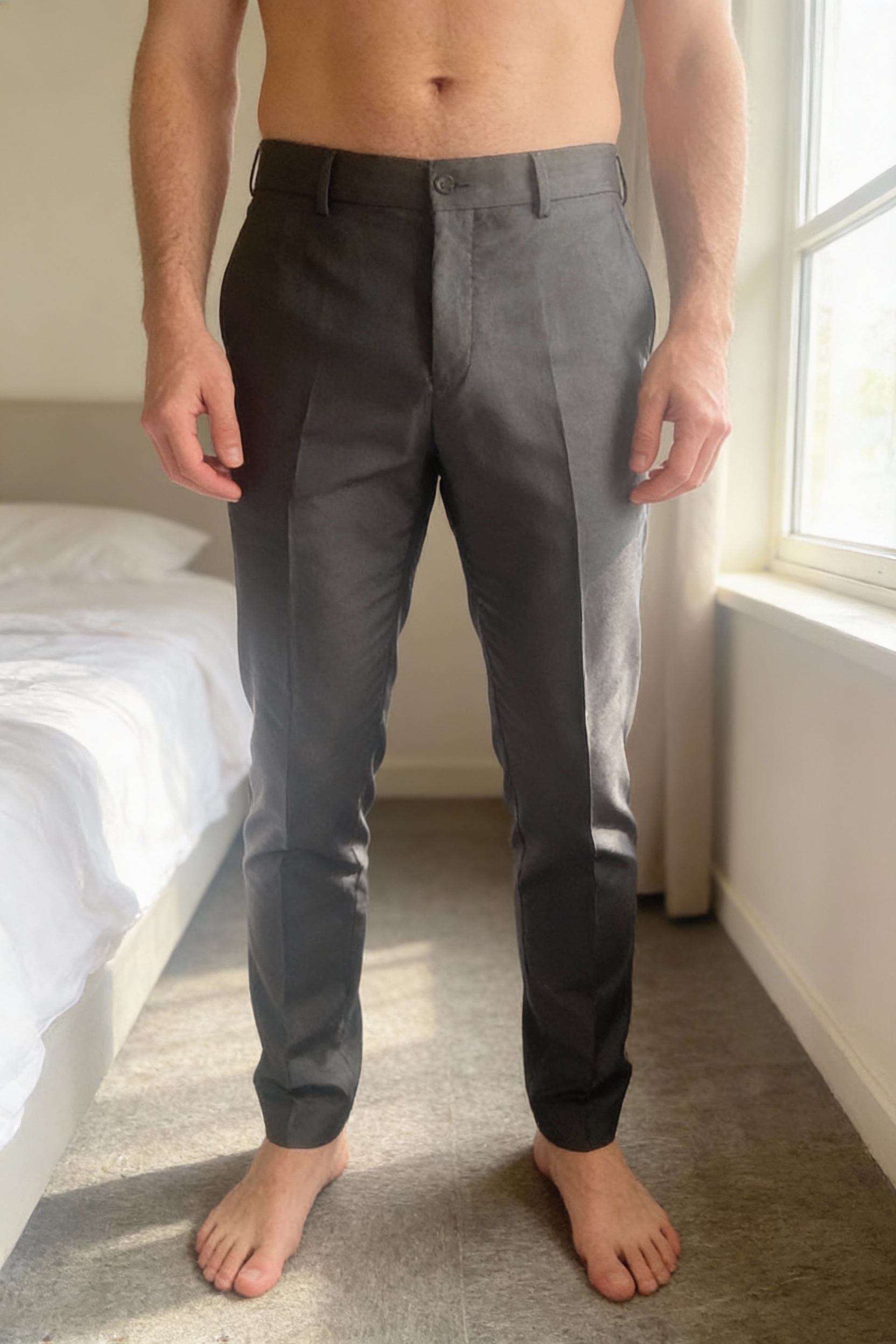 Pantalon costume esprit 50 debout, face à la caméra, dans une chambre à la lumière douce, avec une lumière naturelle filtrant par la fenêtre.