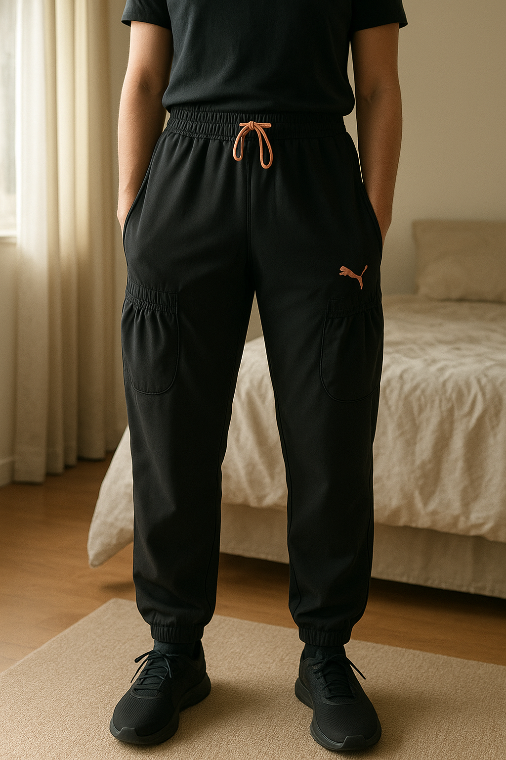Pantalon de sport noir Puma mixte debout, face à la caméra, dans une chambre à la lumière douce, avec une lumière naturelle filtrant par la fenêtre.